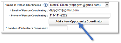 | If the Person Coordinating the Opportunity is not already a designated Coordinator, you can add them as a Coordinator by clicking the “Add a New Opportunity Coordinator” button. 1) Click on the “Add a New Opportunity Coordinator” button. |