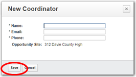| 3) Fill in the required information on the “New Coordinator” box with the required information. 4) Click Save. A new coordinator can also be created while entering information for an Opportunity, Major Event or Template. |