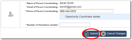 | 2) If you are finished editing/creating the Site Opportunity Coordinator, click “Submit”. Note: A Site Opportunity Coordinator can only create, manage, and edit Opportunities they create themselves or an Opportunity assigned to them by a higher-level Coordinator. A Site Opportunity Coordinator can also create Major Events and Opportunity Templates. |