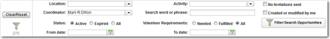 | You can search for an Opportunity in the “Opportunity Management” option the same way as you would through the “Opportunities” option. Note that the Opportunity Management page is automatically filtered to show active Opportunities where you are the assigned Coordinator. |