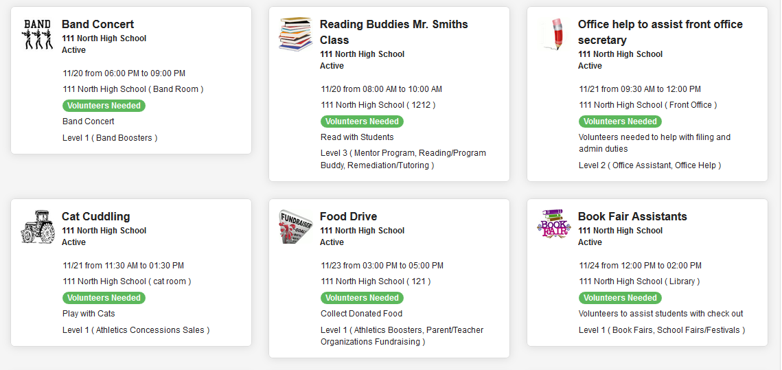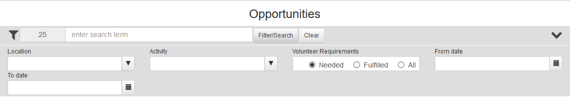 You have the option to filter by location, activity, or by opportunities dates by using the filter boxes. if you volunteer at multiple schools you can narrow the search down by using the Location drop down box to select the school :