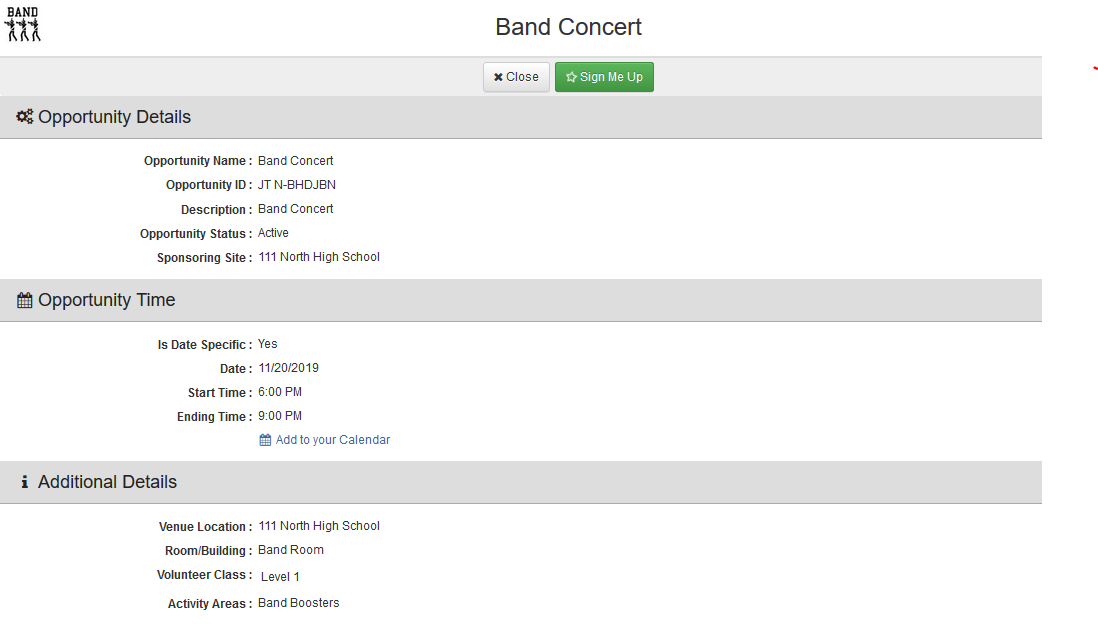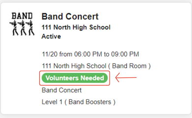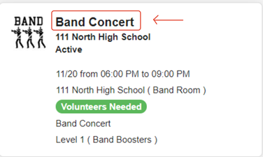 If the list of opportunities show up for you, this is how you will sign up for it - you can click on the name of the opportunity or the Volunteers Needed button(this example is the Band Concert) :