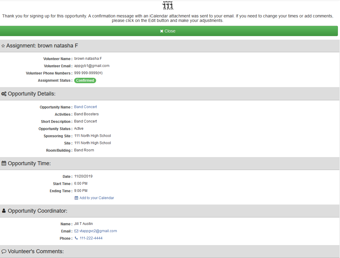 Once you click to sign up you will then see a new screen that shows you that you have now been signed up for the opportunity. You can click the blue Edit button(located at the bottom of the page) to make any comments or changes - that screen looks like this :