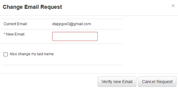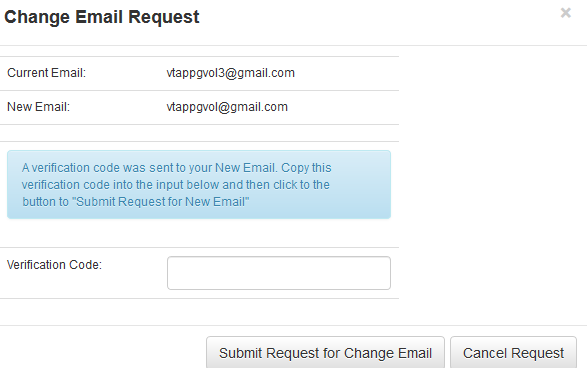 You will be asked for a verification code. Leave this window open and check your email (on the new email account) for a verification code email. Look in your spam/junk/clutter folder if you don't see the email. Enter the verification code and click on the "Submit Request for Change Email" button.